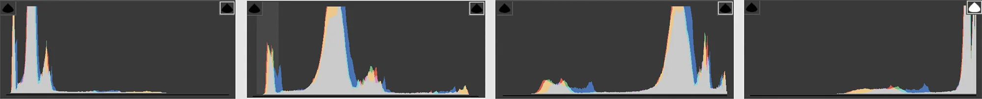 Alle Bilder haben den gleichen Weißabgleich und Schärfungsgrad erhalten. Hier ein Blick auf die Histogramme der einzelnen Belichtungen.
