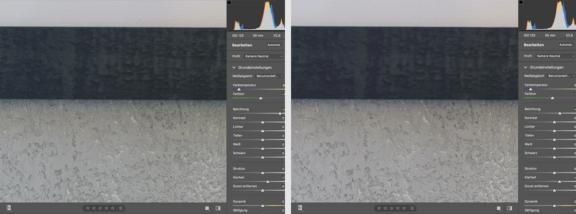 In diesem Test habe ich einfach meine Wand abfotografiert, diese ist keinesfalls 50% Grau, aber sie ist definitiv mehr Grau als Weiß. Alle Bilder wurden von einem Stativ bei Blende 2,8 und ISO125 geschossen. Das Objektiv ist das Sigma ART 50mm f./1,4 . Die Kamera ist die Sony A7R2. Die einzige Variable in den Fotos ist nur die Verschlusszeit. Ich habe anschließend eine kleine Belichtungsreihe geschossen.