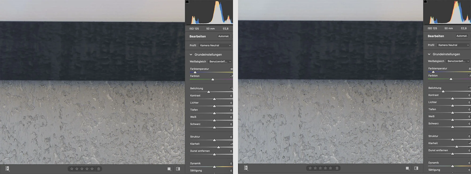 Obwohl beide Aufnahmen bei ISO 125 gemacht wurden, sieht das Linke Bild so als wäre es bei ISO 800 (und höher gemacht) worden. Das Rauschen hat nicht nur die Schärfe reduziert, sondern auch die feine Struktur geht verloren, die auf der rechten Seite noch zu erkennen ist.