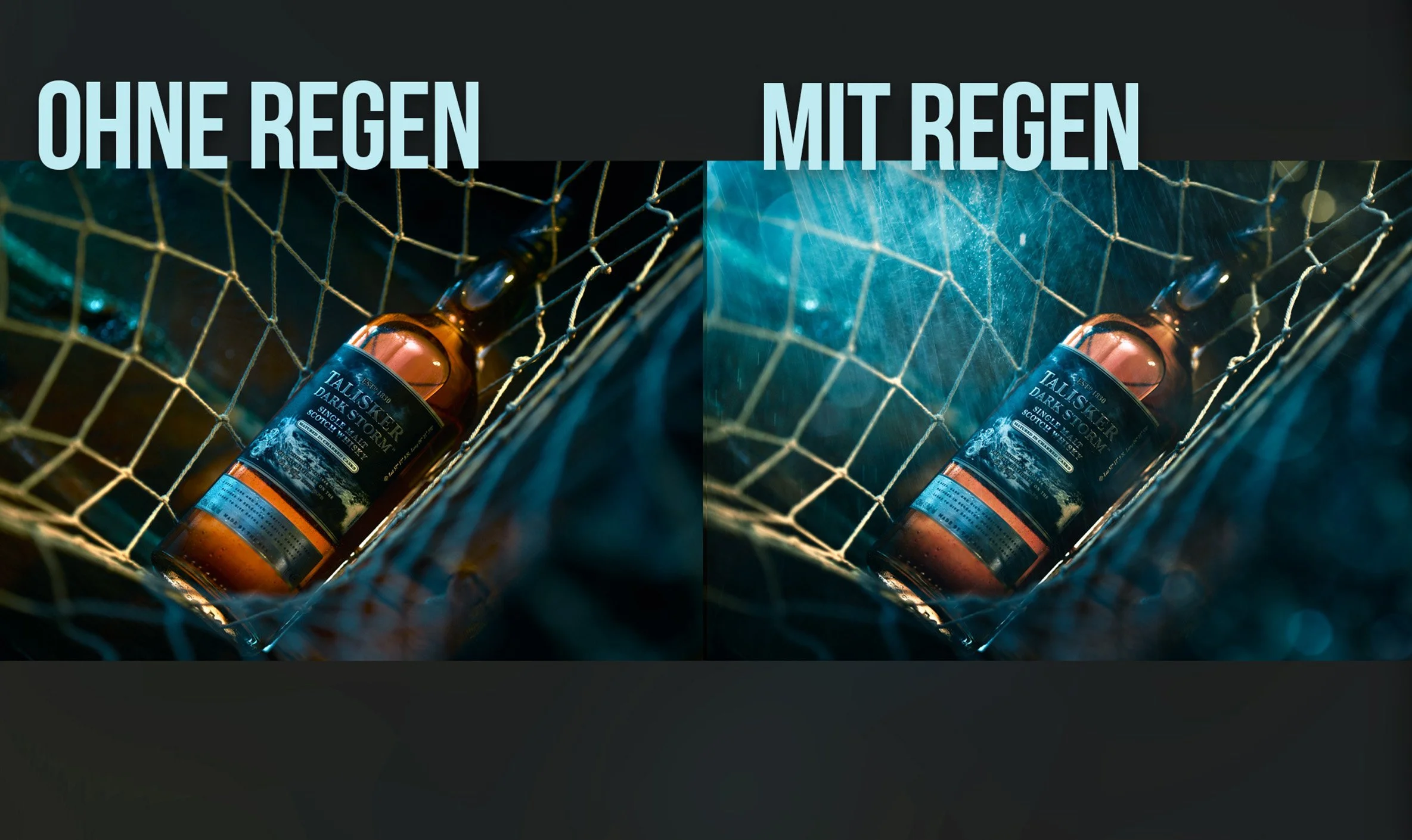 Ein großartiges Beispiel dafür ist das Werbefoto das ich für den Talisker Dark Storm erstellt habe. Der Regen-Effekt verleiht dem Bild eine Stimmung, die den Betrachter sofort in eine andere Welt entführt und das Gefühl vermittelt, dass sich die Flasche tatsächlich auf dem stürmischen Meer befindet.